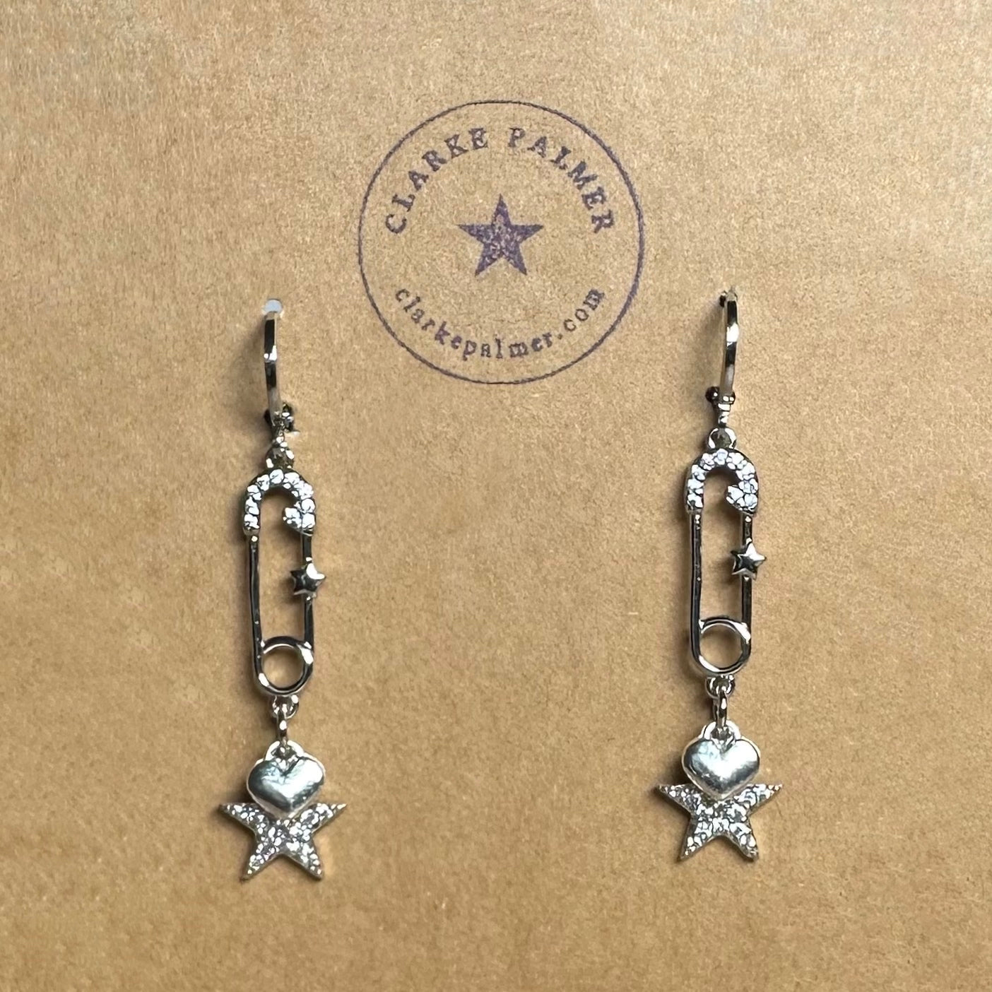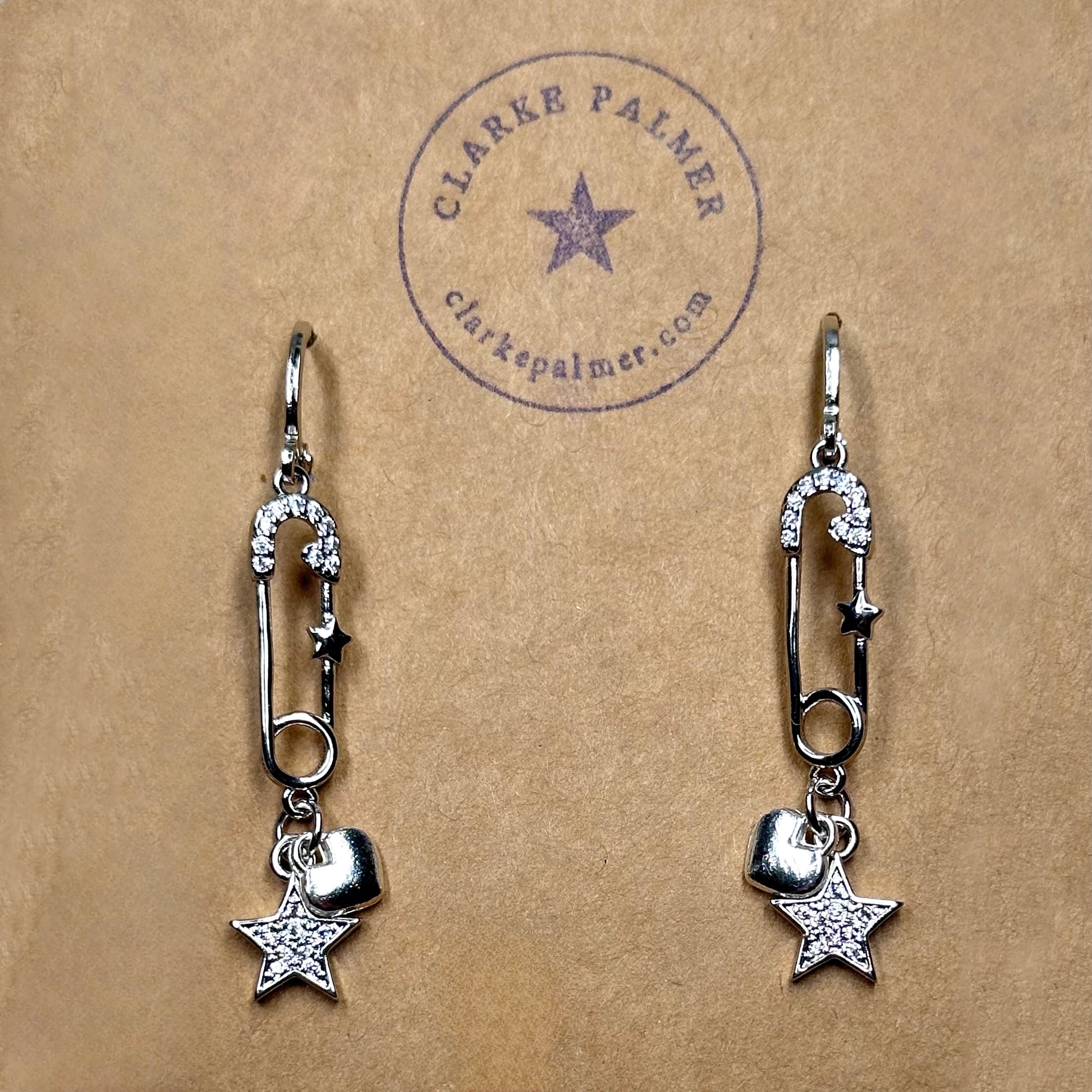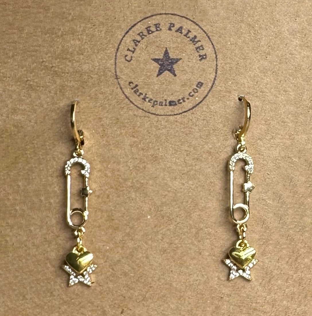 These beautiful earrings have safety pins with CZ stones and a tiny star to one side, large stars studded with clear CZ stones and heart charm pendants. Availavale in 22kt gold or silver vermeil.