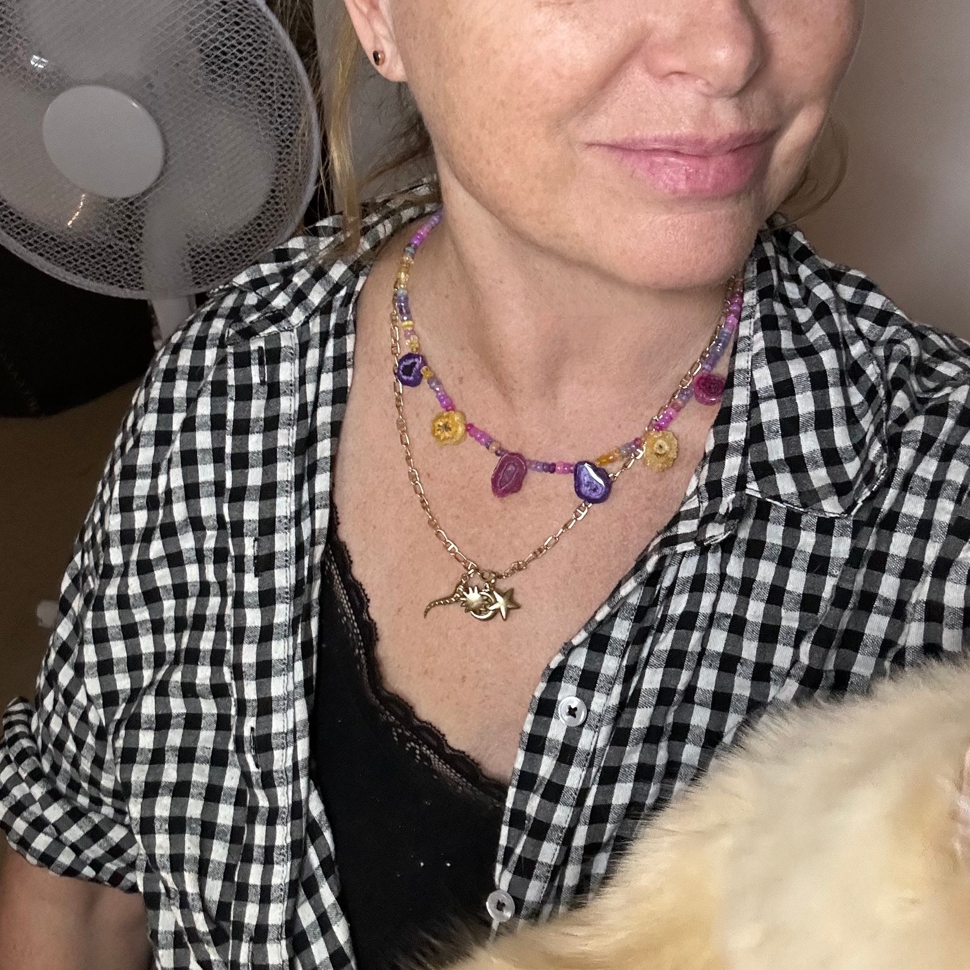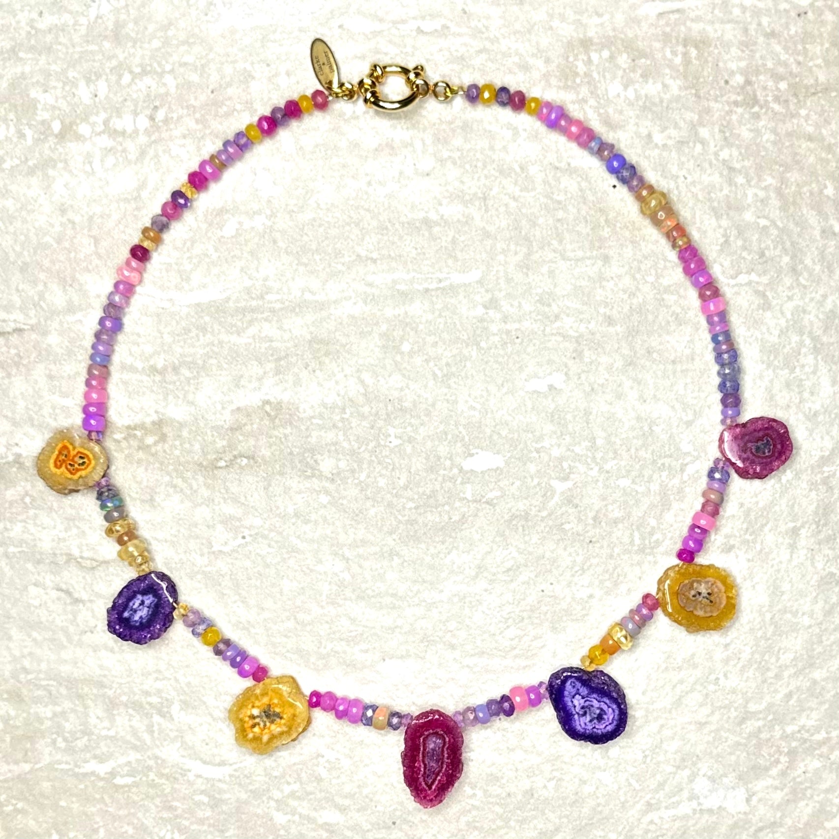 This stunning necklace is handmade from glowing Ethiopian opal, citrine, agate, amethyst and tanzanite handcut rondelles and solar Quartz briolettes in a delightful colour mix of hot pink, royal purple and sun yellow. It has a 24kt gold vermeil sailor clasp. Choose your preferred length in the options.
