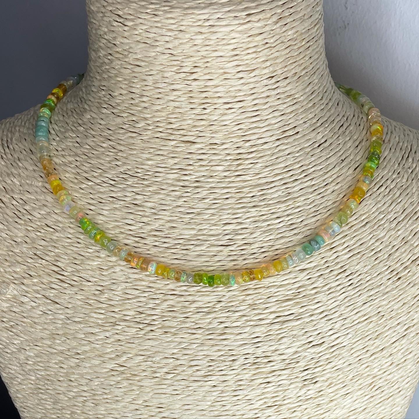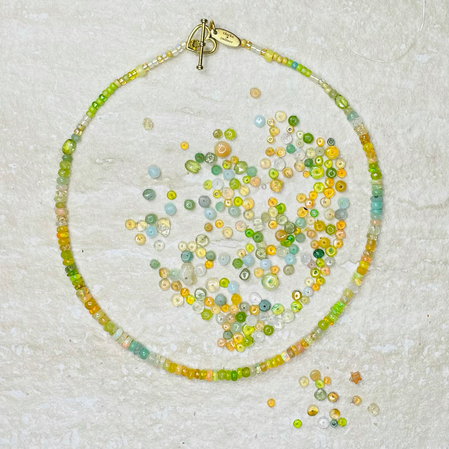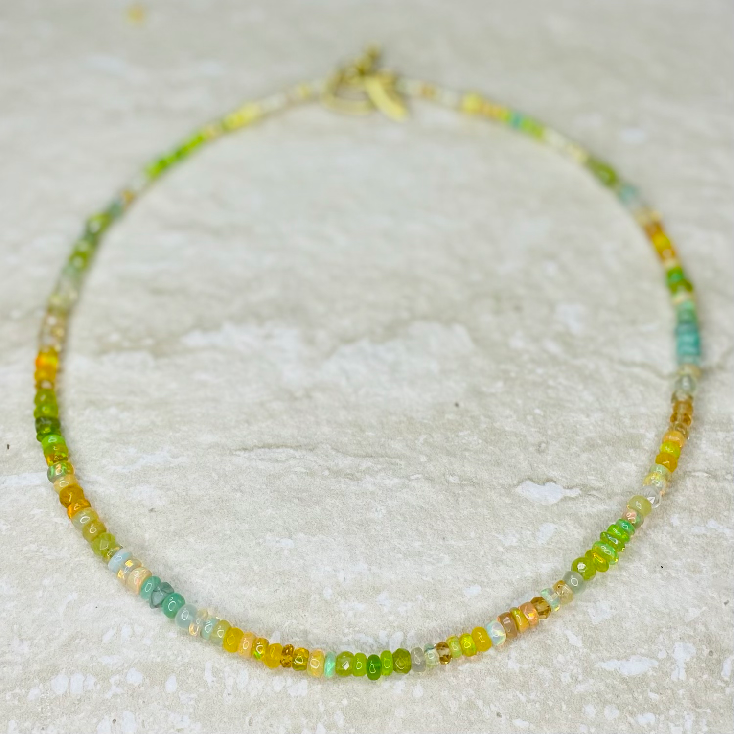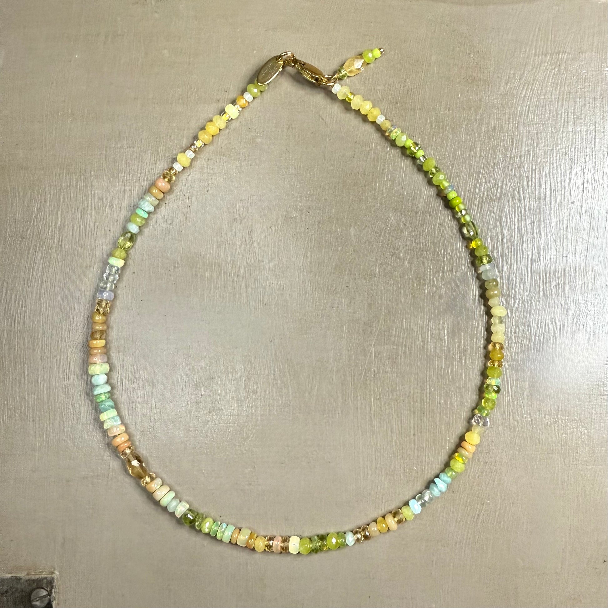 Our Spring Sunlight necklace as worn by writer & artist Stacey Duguid is handmade to order from sustainably sourced opals, tourmaline, emerald, citrine, peridot and rainbow moonstone, blended with Preciosa and Miyuki beads.
