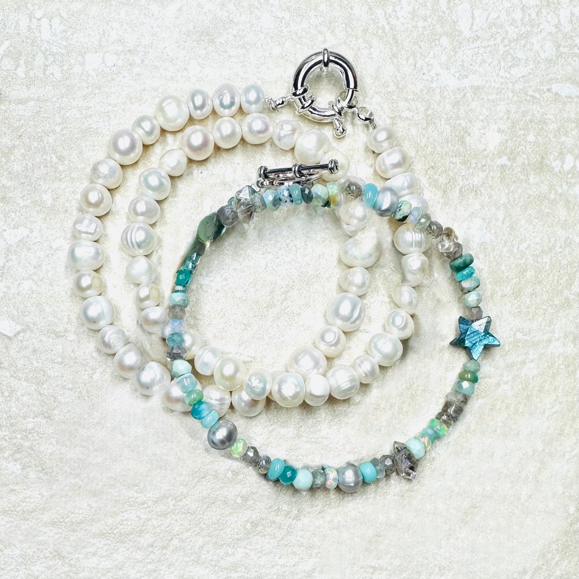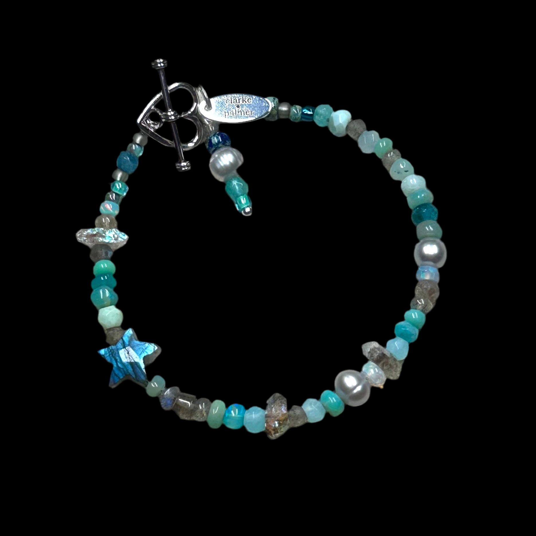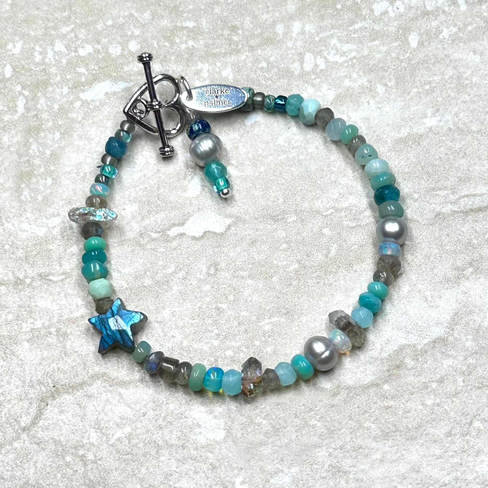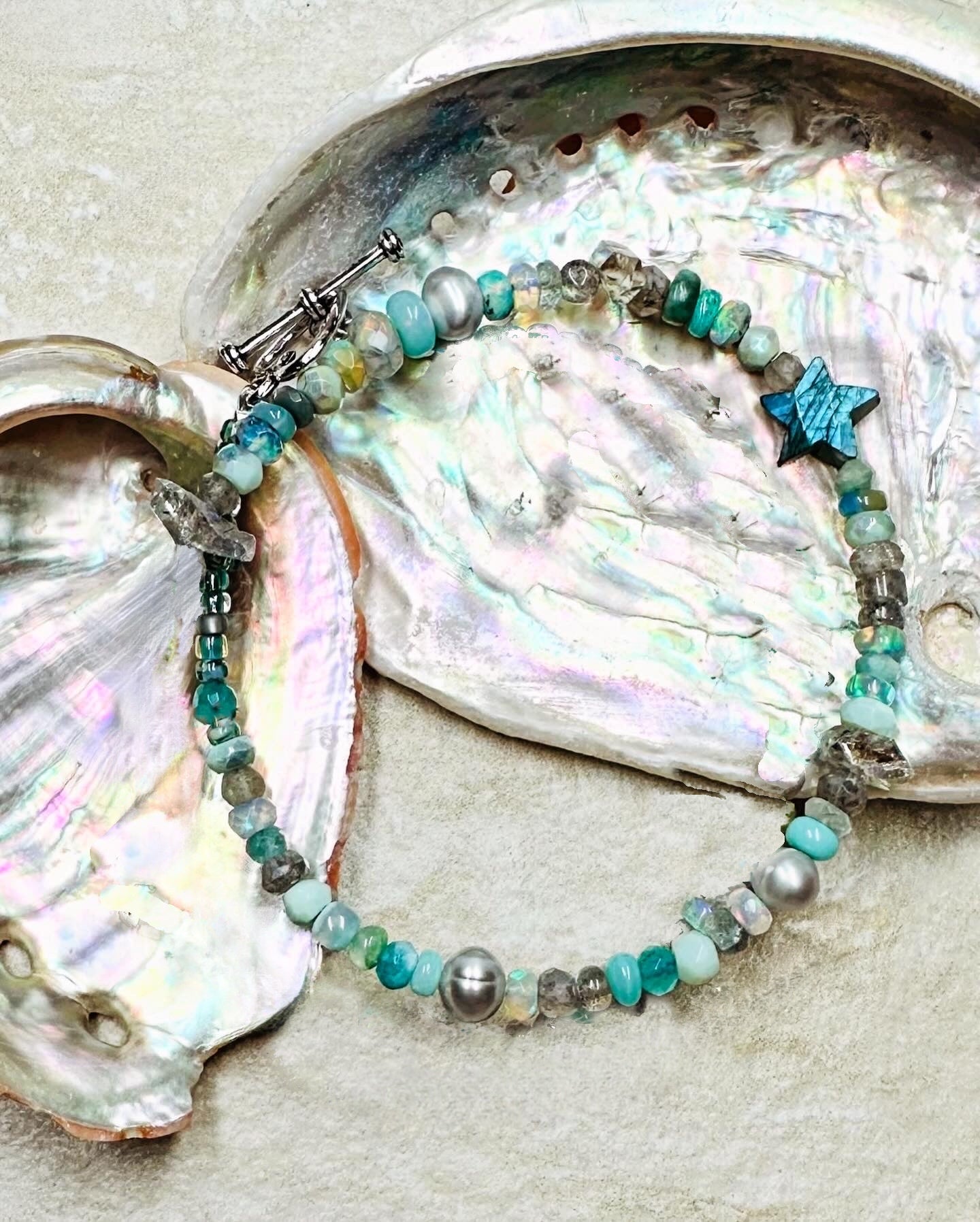 This beautiful bracelet is inspired by the magical beauty of mythical mermaids and their ocean environment. Featuring a shimmering labradorite hand cut star, it blends precious metal coated Herkimer diamonds, pale dove-grey pearis, smooth and faceted rondelles in pale turquoise and azure amazonite, opals and labradorite.