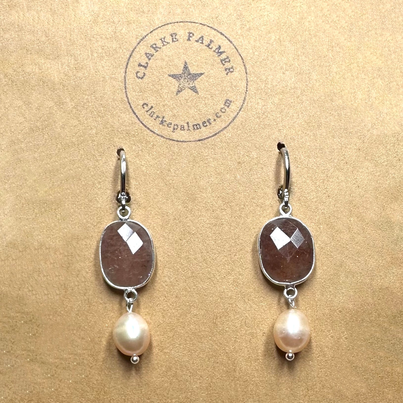 These beautiful drop earrings feature hand cut faceted strawberry quartz ovals set in silver with black pink pearl. On silver plated huggie hoops.