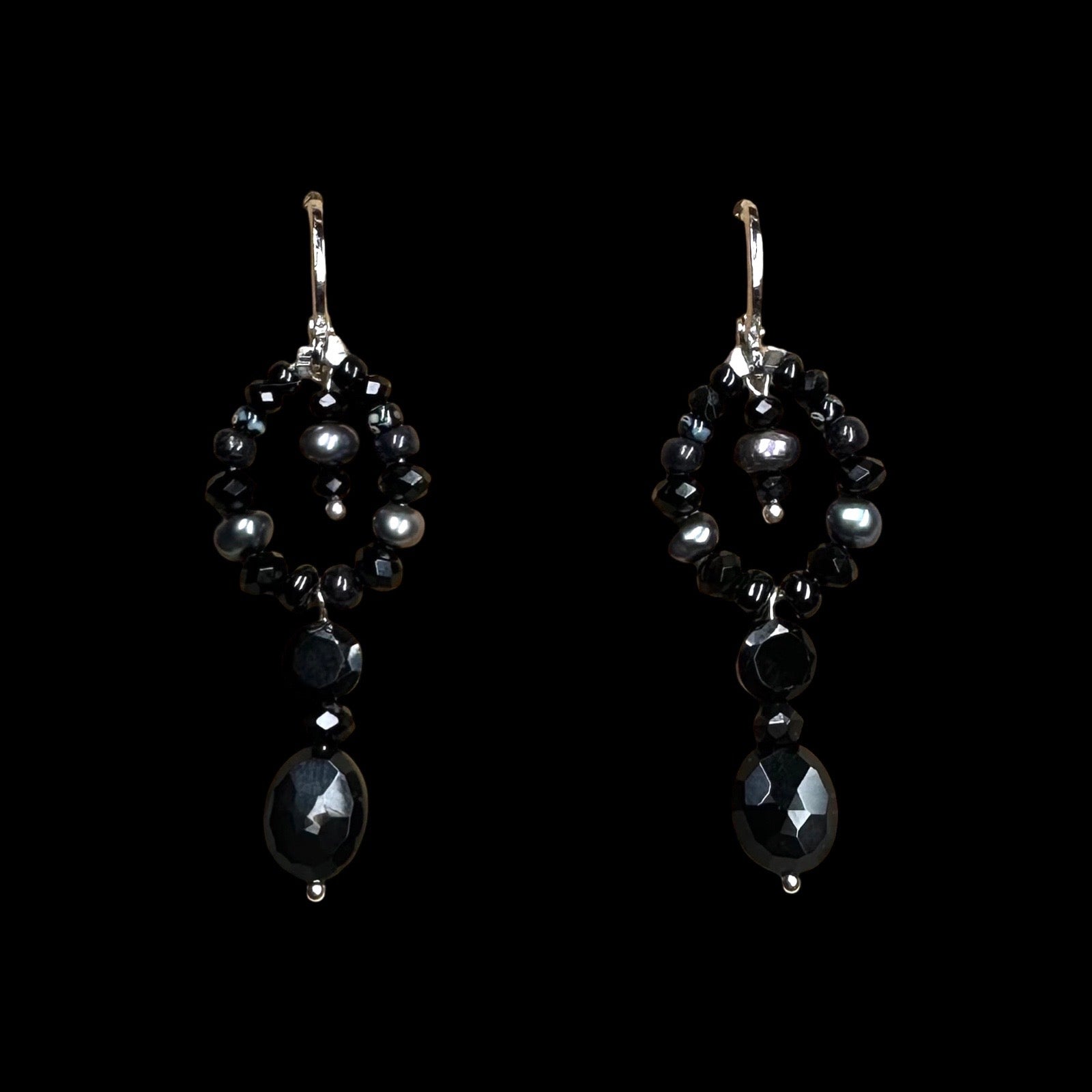 Part of our Precious Elements Collection, the 'Tish' drop earrings are handmade from spinel and onyx rondelles, with black pearl and faceted spinel oval drops.