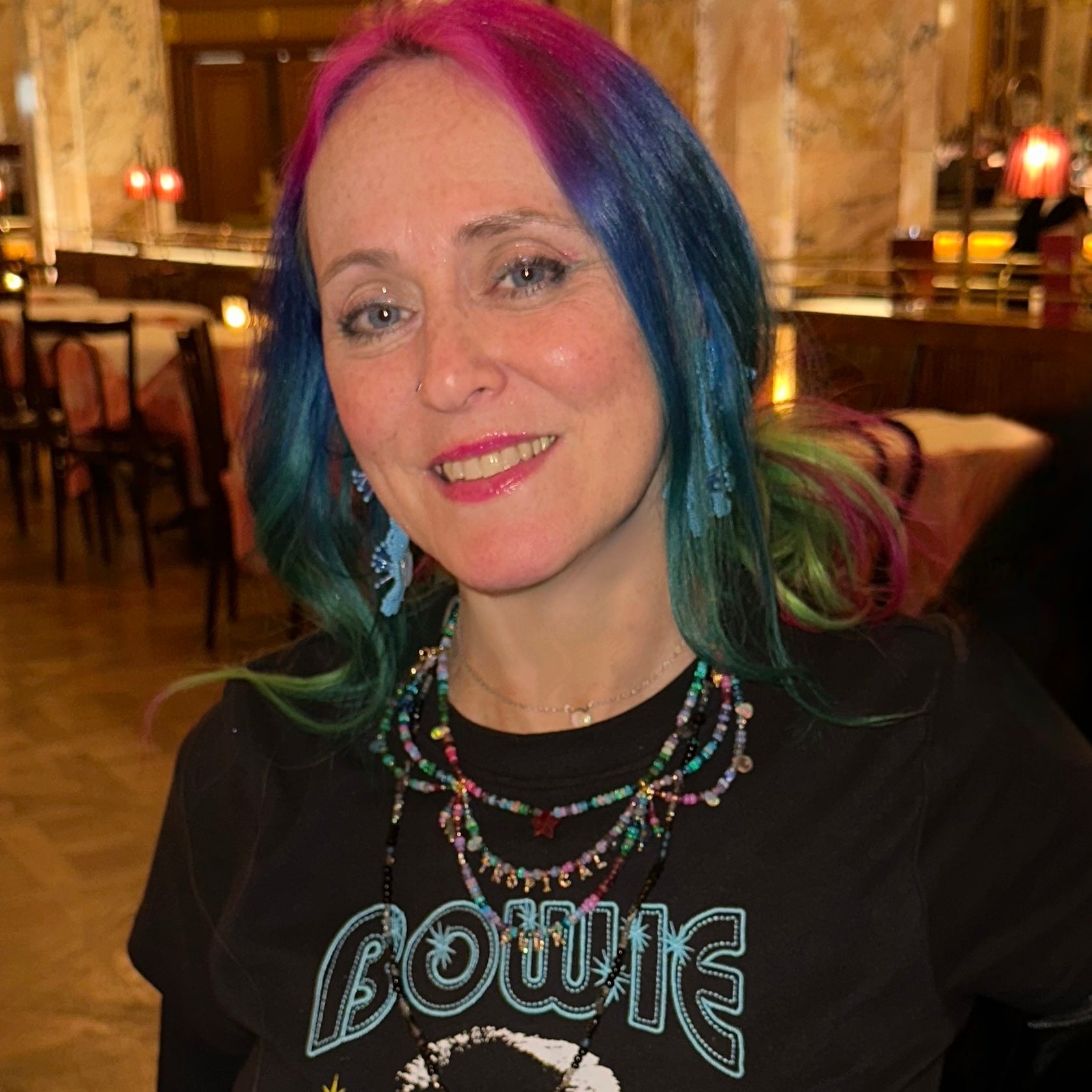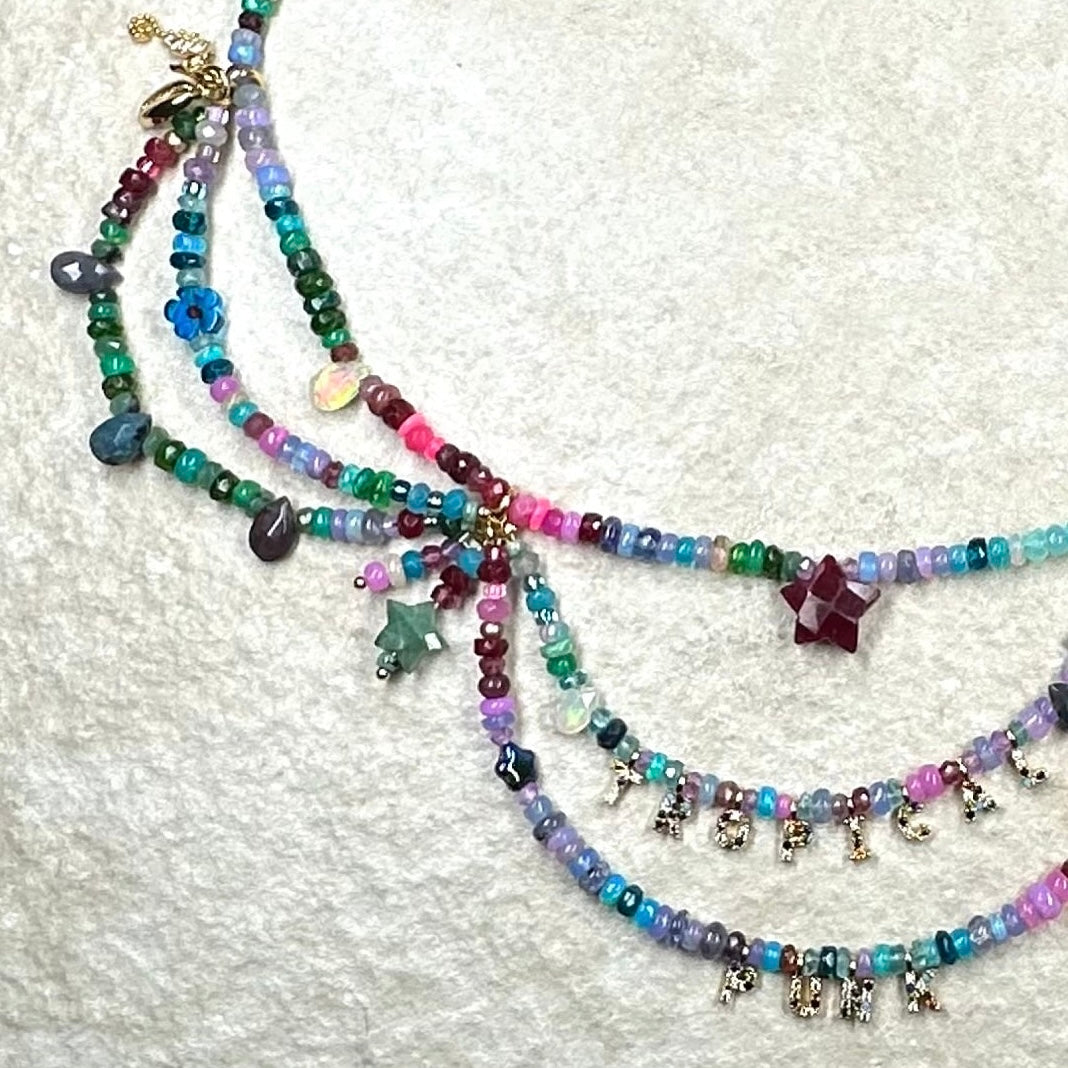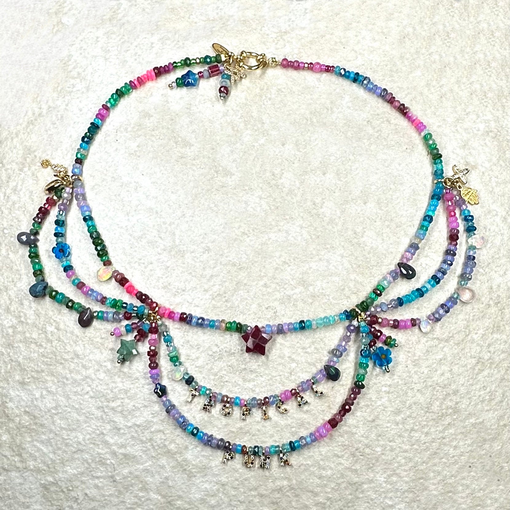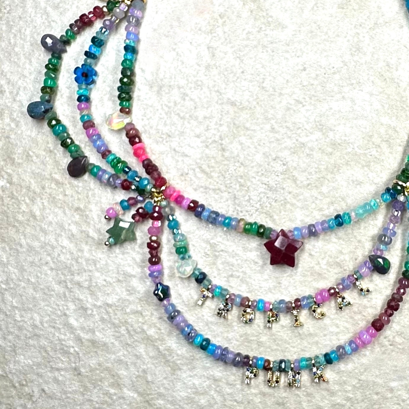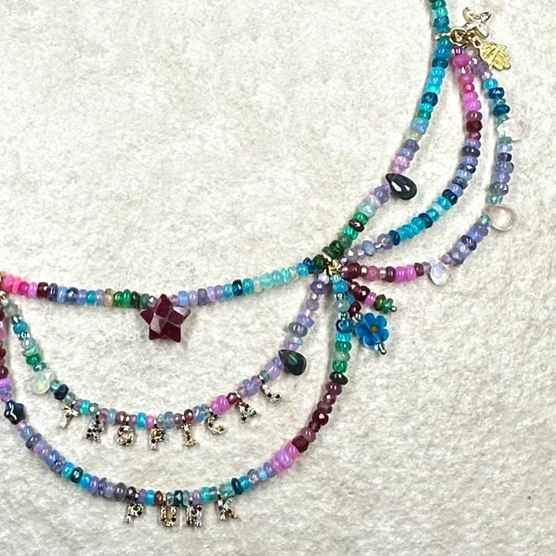 We have mixed her favourite ombré shades of lilac, magenta, aqua and emerald Ethiopian opal, ruby, bright pink moonstone, tourmaline, garnet with chrysoprase, blue topaz, aquamarine, emerald and tanzanite.