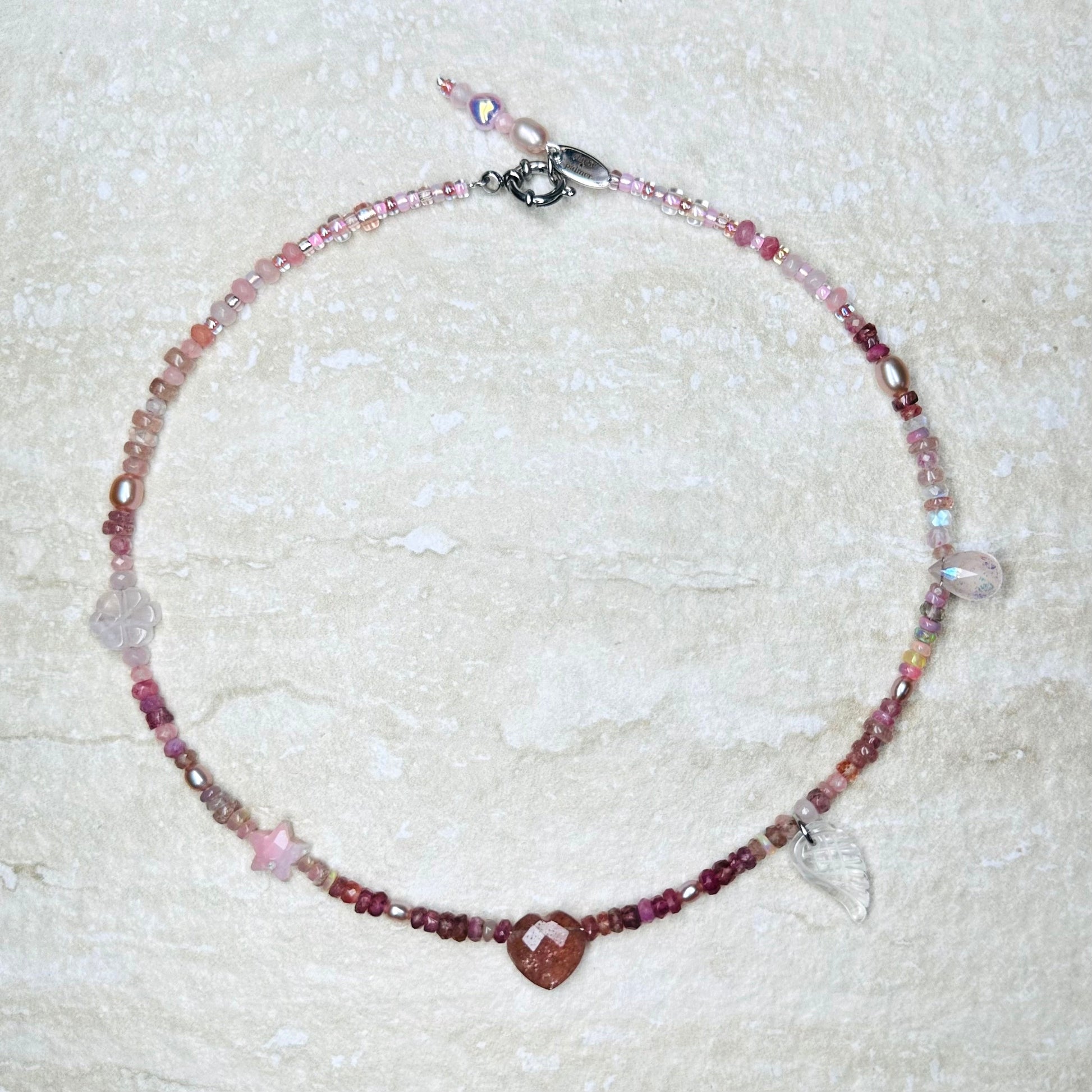 Centred by a hand-cut faceted strawberry quartz heart, with a pink opal star, rose Quartz flower, clear Quartz angel wing and precious metal coated rose Quartz Briolette, this beautiful necklace mixes blossom pink opal, dusty pink tourmaline, pink sapphire, andesine, rose quartz rondelles with lilac oval pearls. Choose from gold or silver vermeil sailor clasp in the options and extra letters to add your own personalisation.