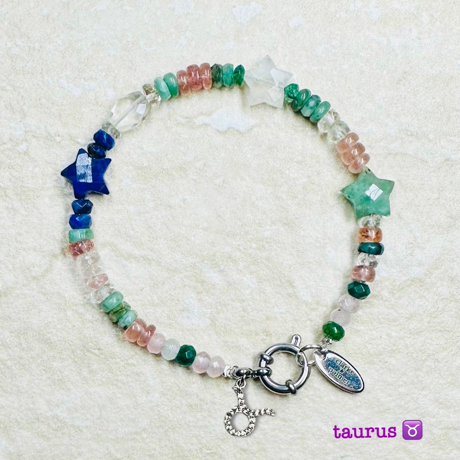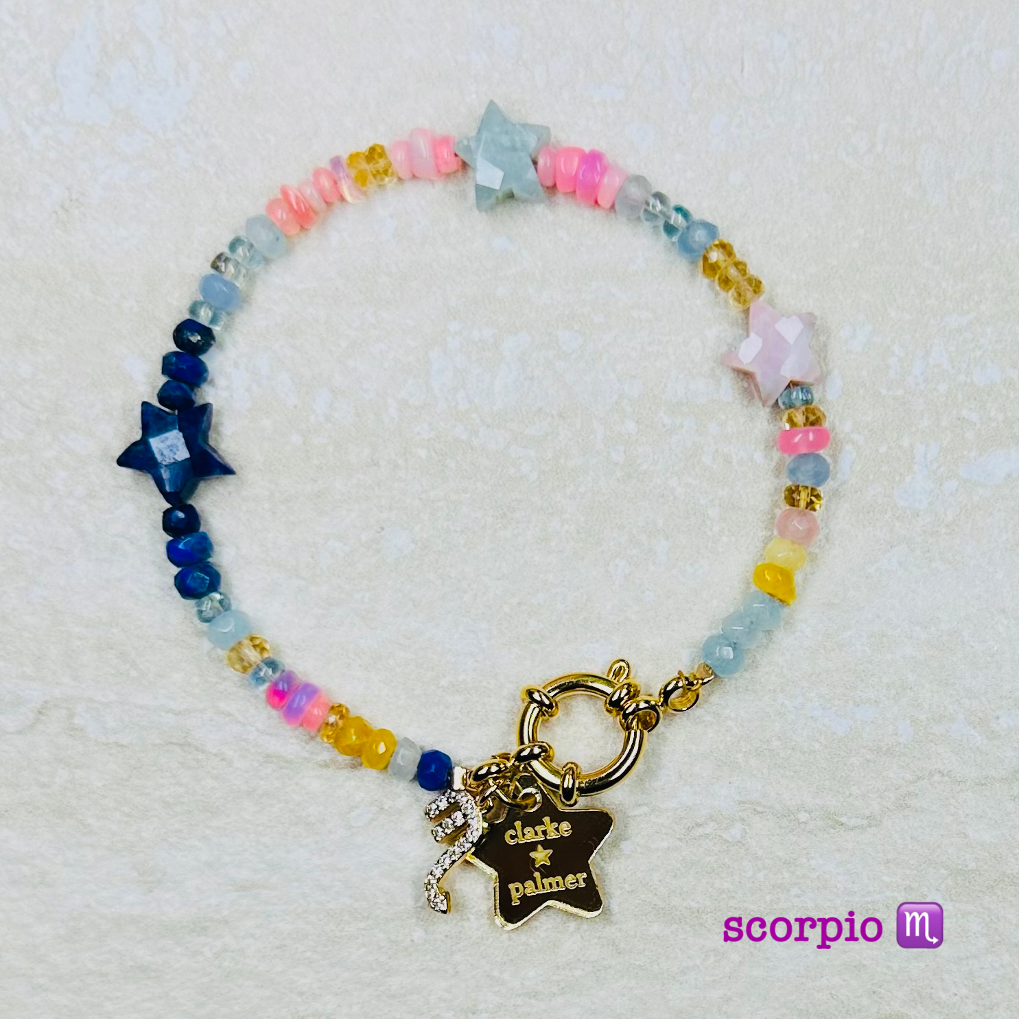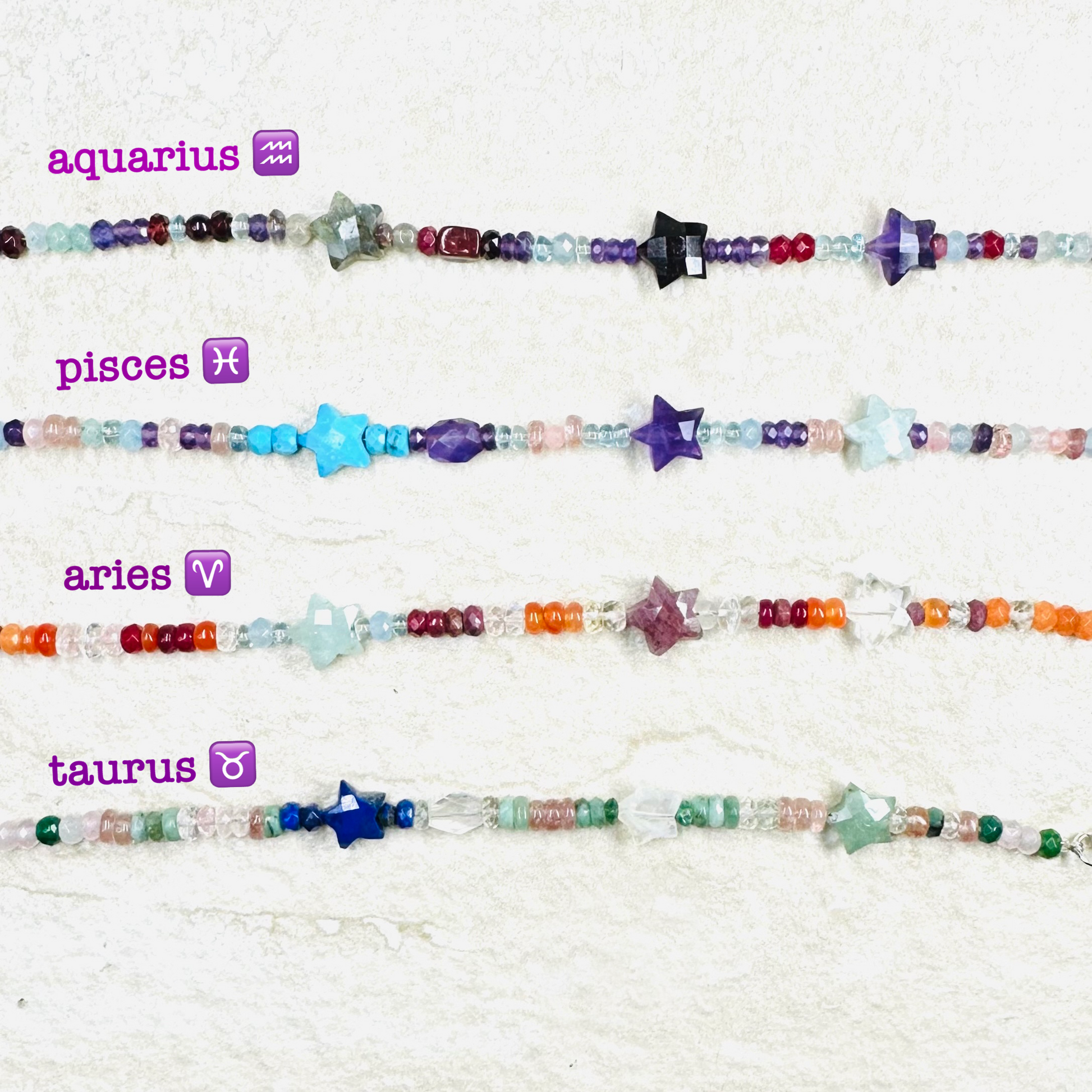 These special bracelets each feature three hand cut faceted gemstone stars, faceted and heishi rondelles and a 22 kt gold vermeil CZ horoscope charm with a sailor clasp. (You may request silver vermeil if you wish). Each bracelet is unique and all are slightly different. Choose your horoscope sign and preferred length in the options.