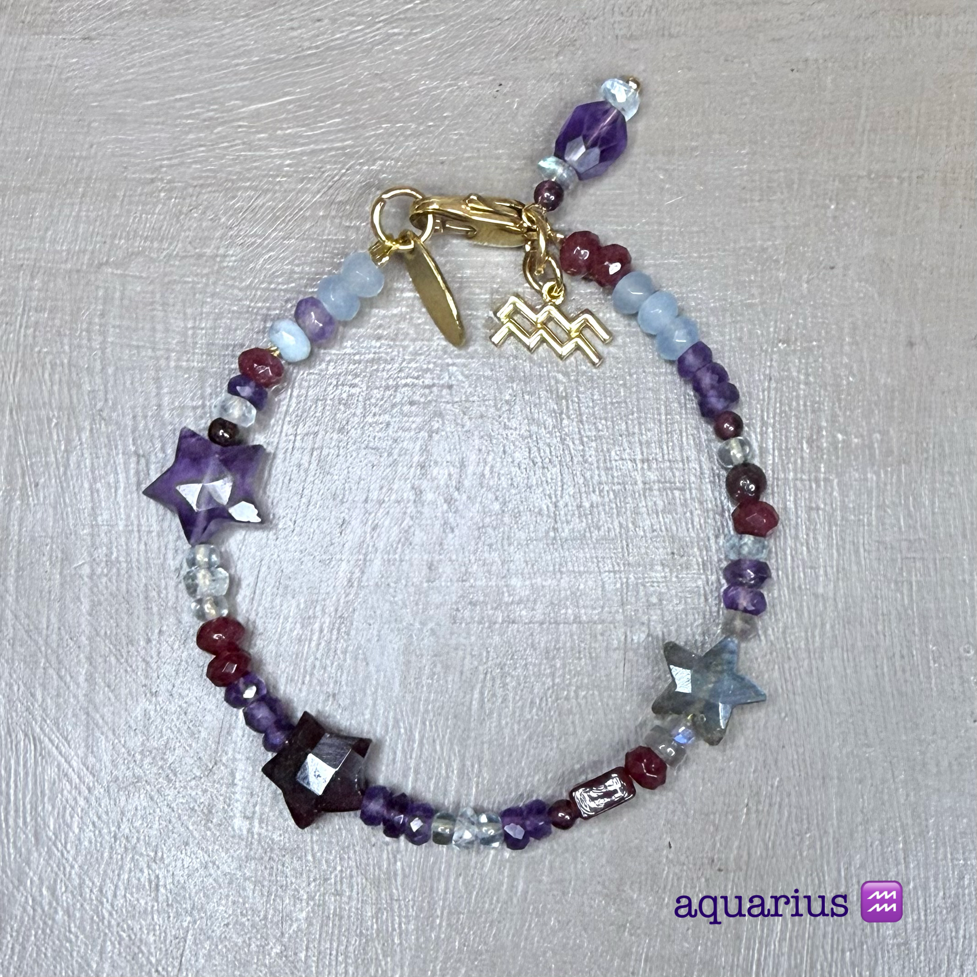 Shimmering labradorite, crystal blue aquamarine, deep red garnet and royal purple amethyst.
